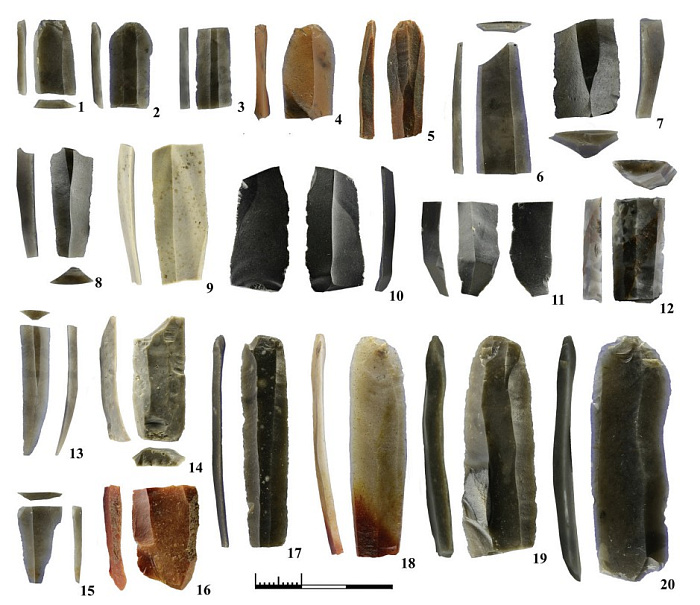 Из таких пластин изготавливали вкладыши для составных орудий, прежде всего охотничьего оружия. Сами наконечники и древки до нас не дошли, но кремнёвые элементы сохранили следы использования: микросколы, ретушь, заполировку. Также среди находок — скребки для обработки шкур, острия для охоты.