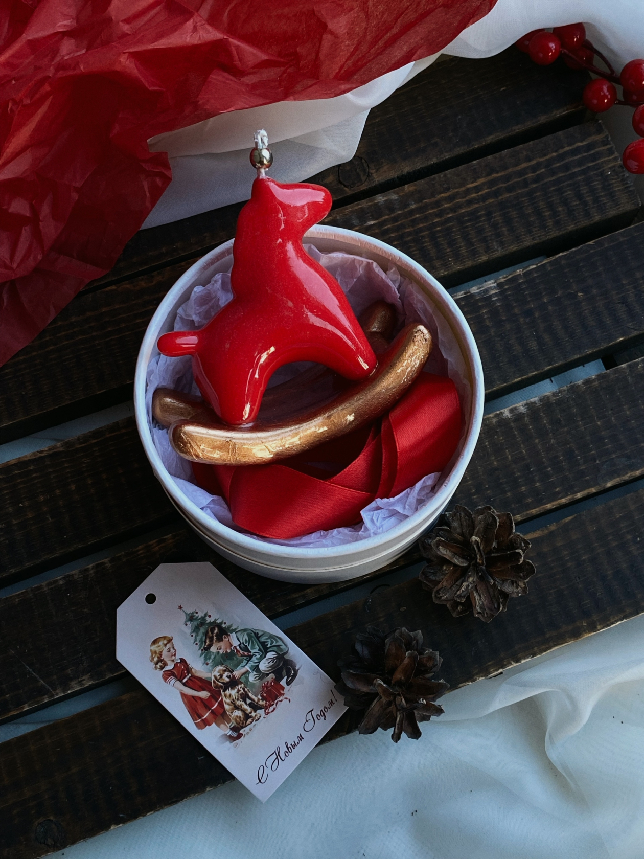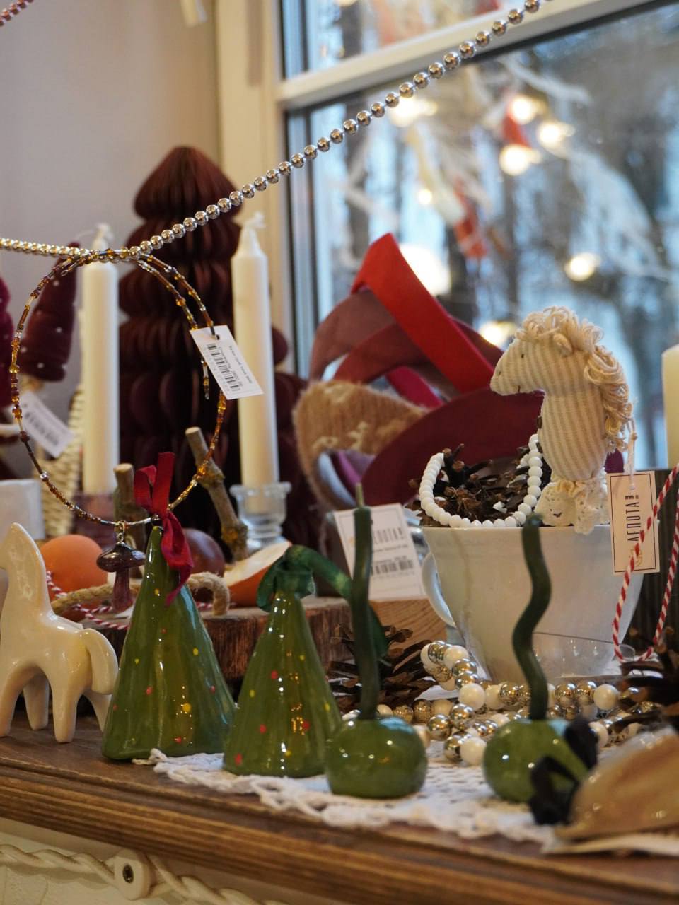 К Новому году здесь можно найти ёлочные игрушки, а в качестве подарка для ценителей русского стиля подойдут парфюмированная свеча «Дед Мороз» или твёрдые духи «Снегурочка».