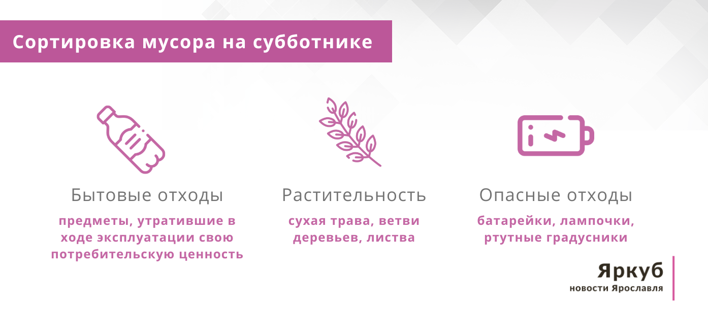 Во время субботника собранный мусор может быть разнообразен: от пластиковых банок, пакетов и бутылок до сухих веток, листьев и скошенной травы. Важно, что при уборке территорий необходима сортировка. Растительность, бытовой мусор и опасные отходы (батарейки, лампочки, ртутные градусники) нужно раскладывать по отдельным мешкам.