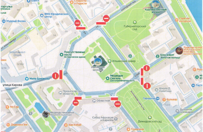 Запрещающие знаки установят на участках улиц Кирова, Нахимсона, Советской, площади Челюскинцев, в Советском и Народном переулках. Таким образом, будет воспрещён въезд на Советскую площадь. Ограничения связаны с проведением массовых мероприятий, а также монтажом и работой главного областного катка.