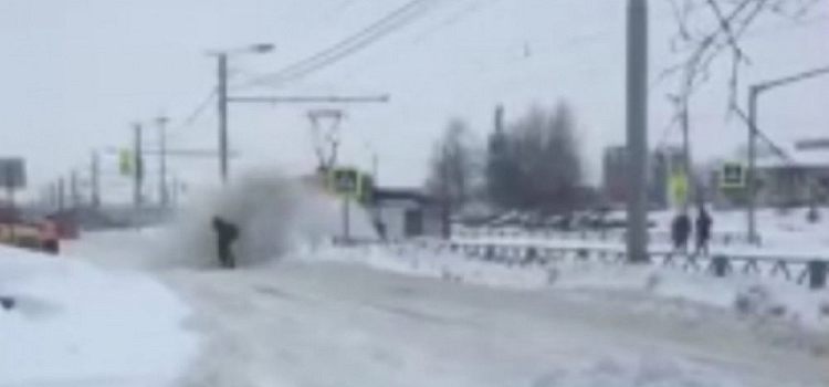 На улице Бабича по сложной системе техника пыталась справиться с дорожным препятствием. Однако сметенные с рельс глыбы снега летели в сторону пешеходов. Один из них попал под лавину с головой.