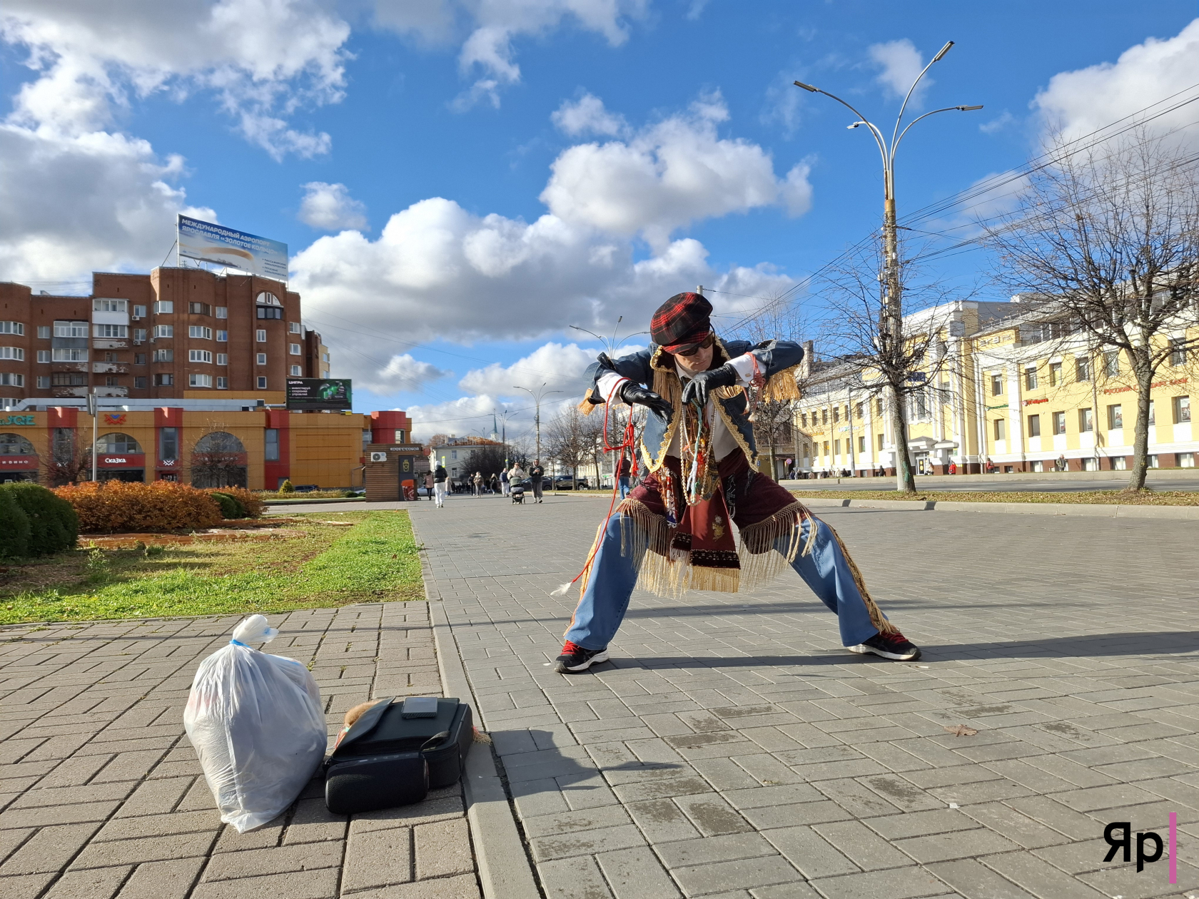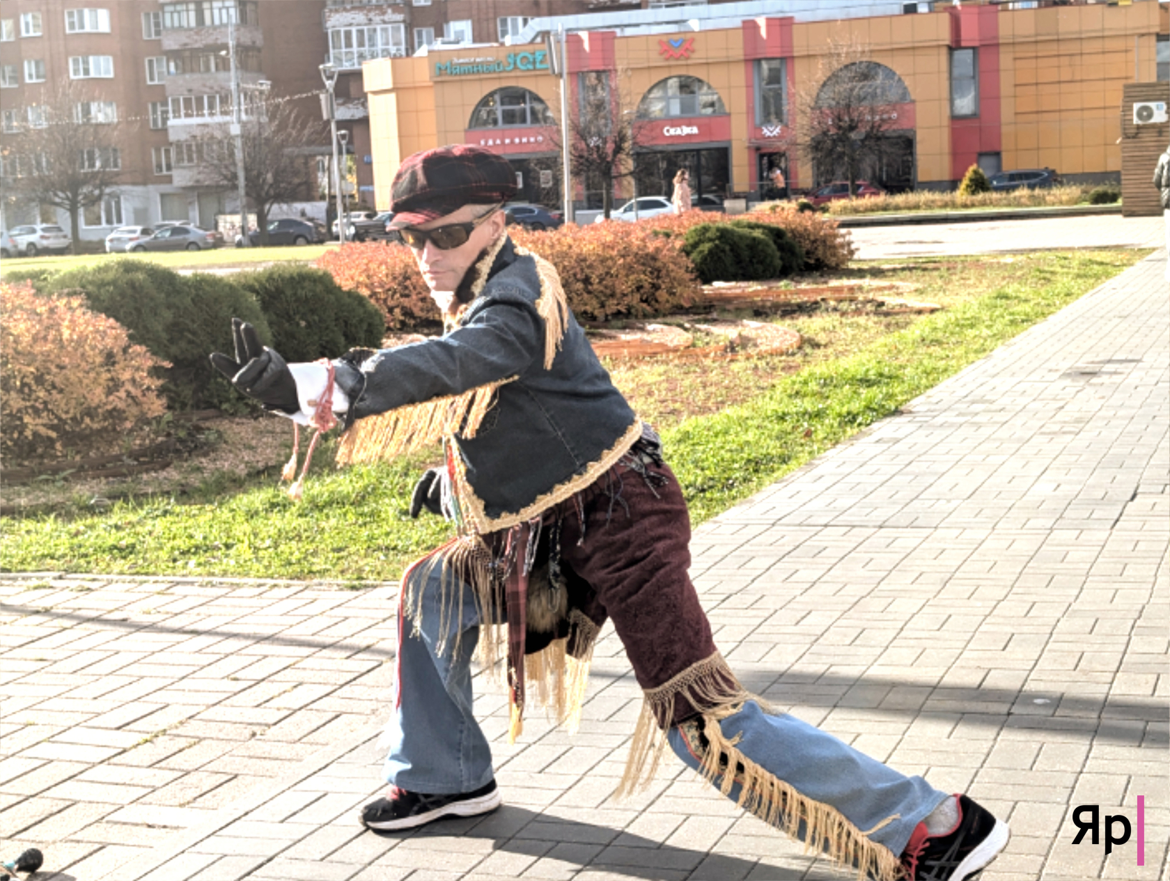 Ярославцы на улицах и площадях города всё чаще стали замечать мужчину, танцующего в необычных костюмах. Слишком, пожалуй, яркий, в своих неизменных солнцезащитных очках и джинсовке, отороченной мехом... Одни восхищаются, другие молча улыбаются, третьи скорее хватаются за телефон, а кто-то даже крутит пальцем у виска. И всё же прижился он среди серых городских будней.
