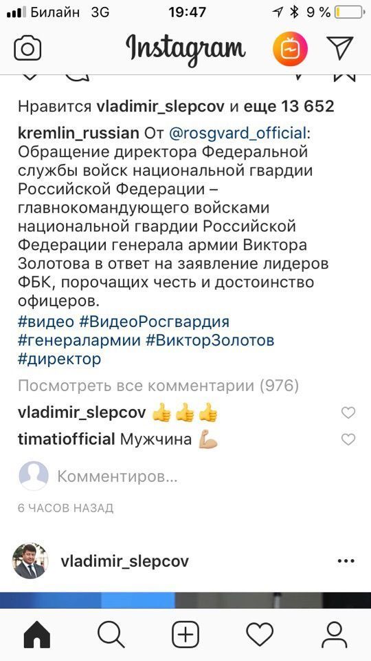 Владимир Слепцов со своего официального аккаунта в Инстаграме поставил лайк под видео Виктора Золотова и написал комментарий: три пальца вверх.
