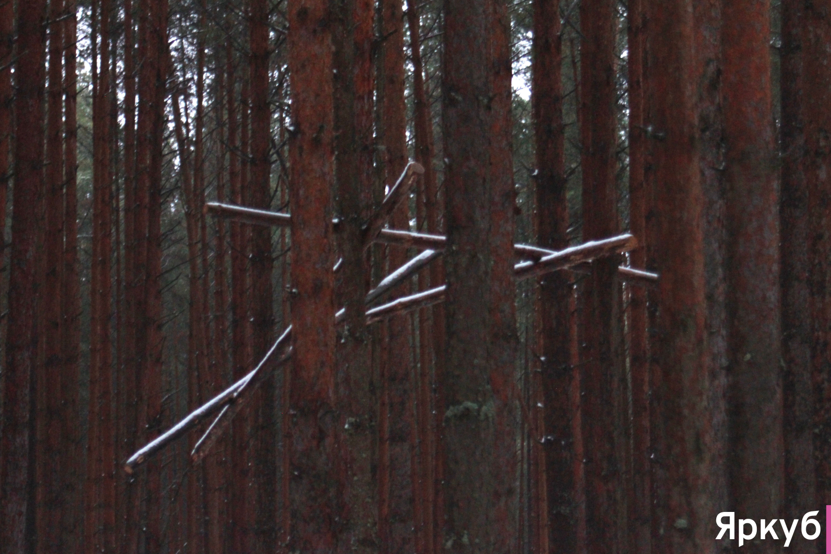В глуши леса притаился заброшенный шалаш, сооружённый из множества одинаковых по величине сосен