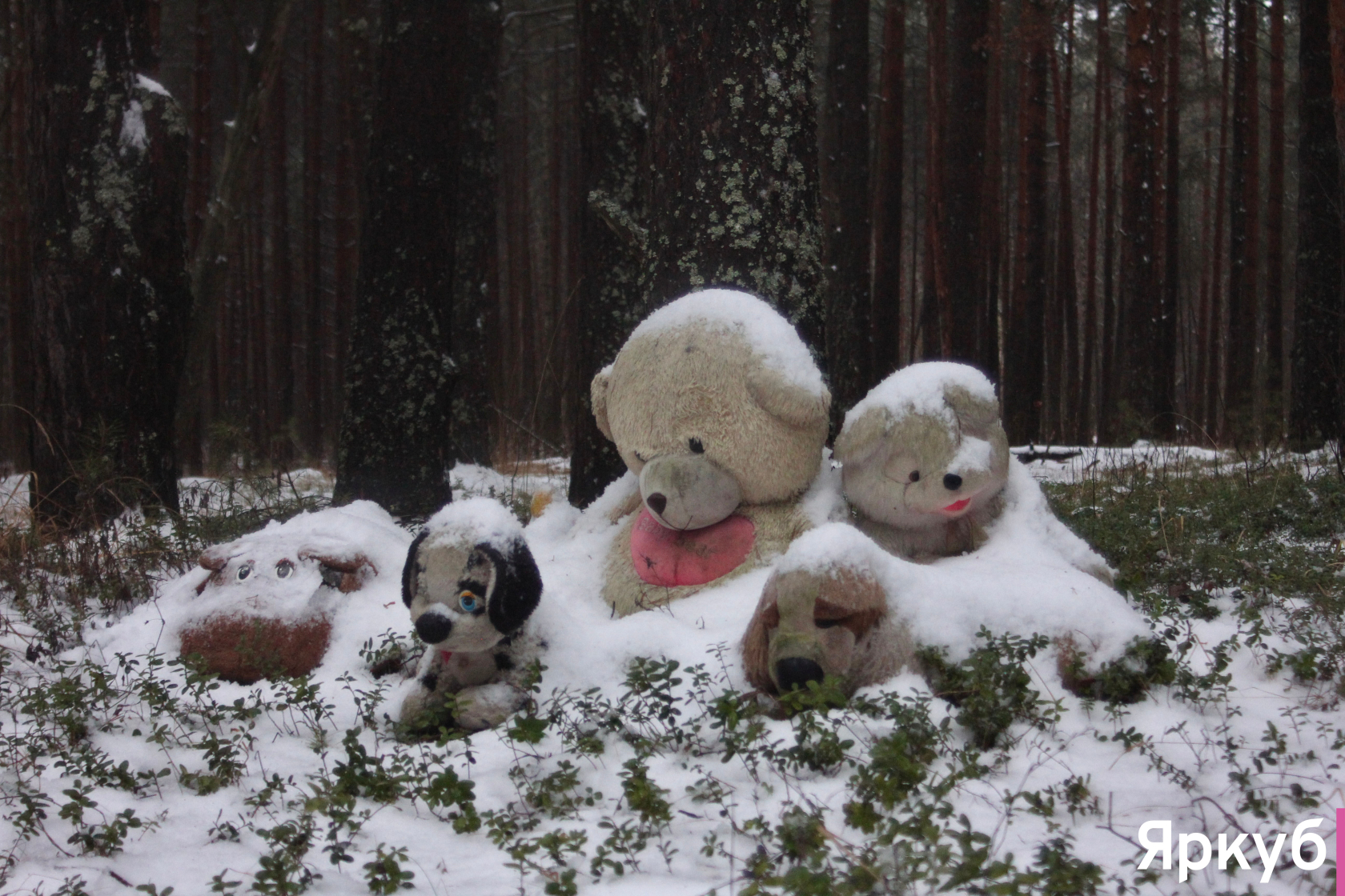 Среди старых сосен лежат детские игрушки, будто кто-то специально их принёс и посадил полукругом, создав единую жуткую композицию