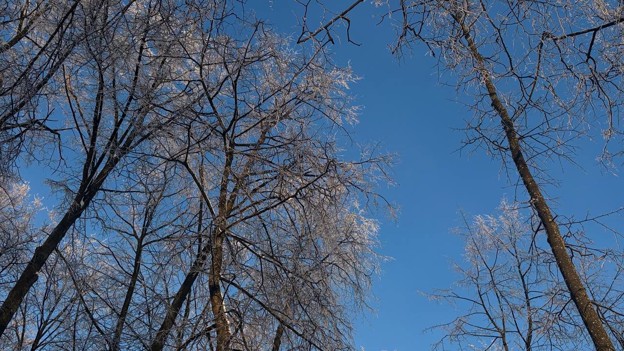 Это разрисованное красками небо? Глубокая, насыщенная синева зимнего неба, похожая на густую акварель. На её фоне каждая заиндевевшая ветка прорисована с ювелирной точностью, превращаясь в светящийся контур. Деревья стоят, будто бережно осыпанные мелкой сахарной пудрой, а снег лежит не грубыми сугробами, а тонким, воздушным слоем.