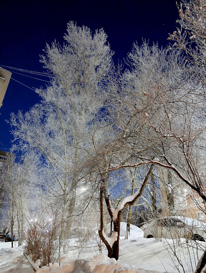 Это звёзды упали на дерево? На бархатном сине-чёрном небе — чистейшая белизна. Ветви сплетены в кружево тоньше паутины. Это не пейзаж, а тихая симфония для глаз.