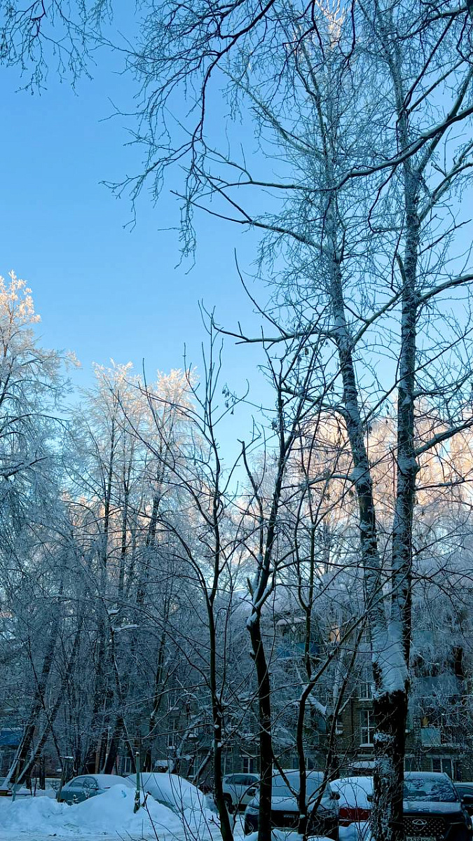 Это огоньки на ветках? Мороз проявил себя ювелиром, вырастив на ветвях ажурный лес из ледяных игл. При свете солнца он вспыхивает алмазным огнём.