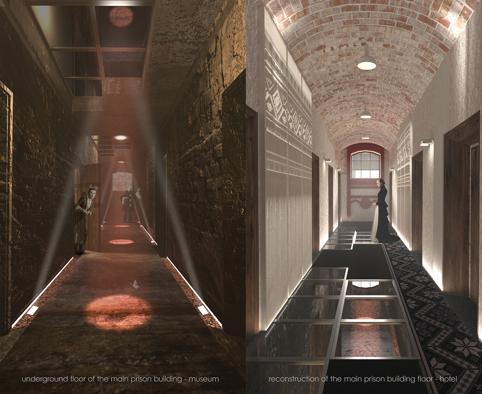 Особое внимание уделено сохранению исторического характера комплекса. В проекте предусмотрено использование существующих каменных стен и элементов тюремной архитектуры. Через инсталляции, работу со светом и тенью предлагают подчеркнуть особенности каждого помещения.