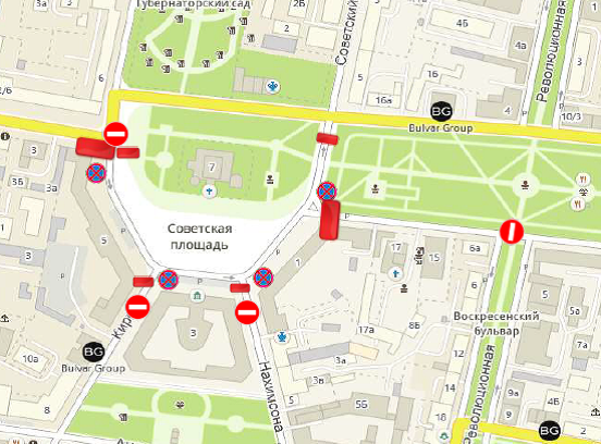 Кроме того, на Советской площади уже с шести вечера пятницы введён запрет на остановку и стоянку.