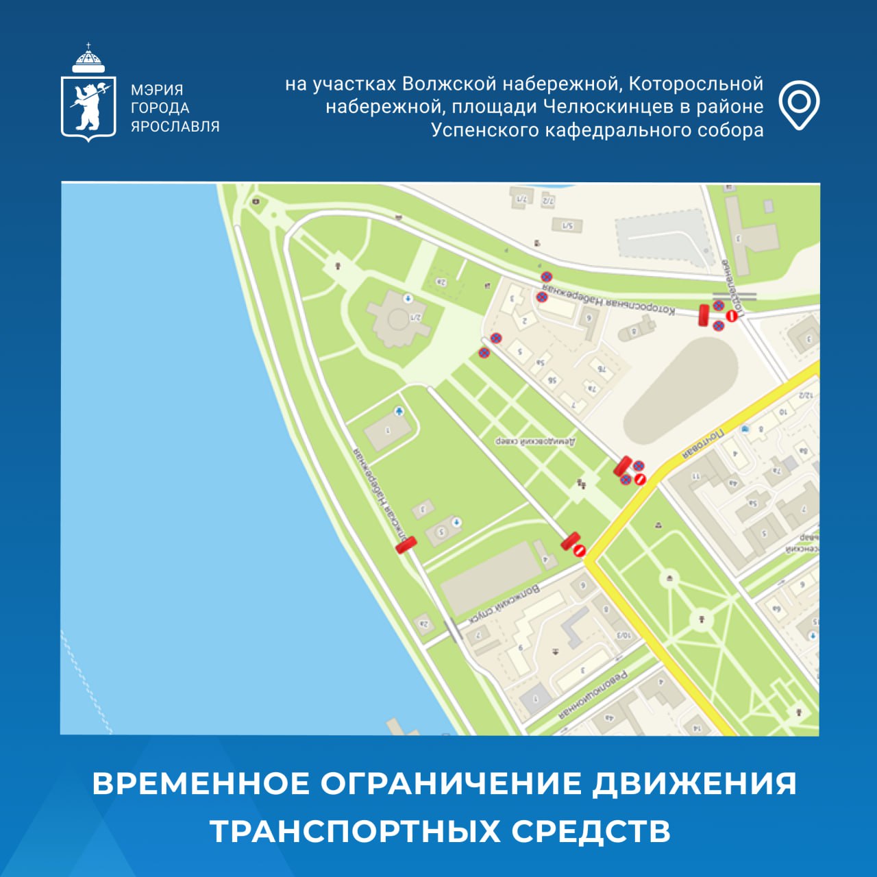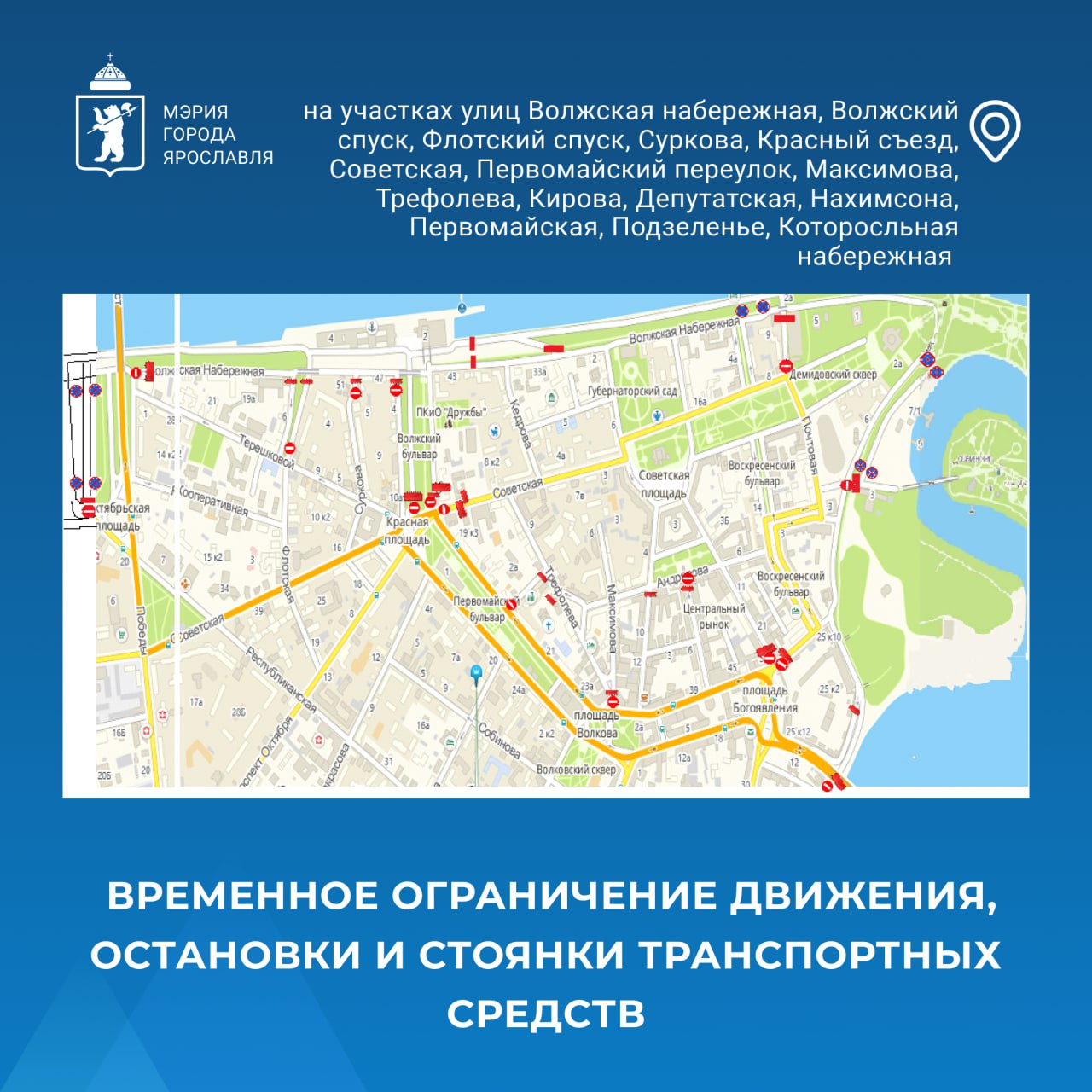 А с 19:00 субботы и до 18:00 воскресенья ограничения будут действовать на участках улиц Которосльная набережная, Волжская набережная, Пятницкий съезд, Флотский спуск, Победы, Красный съезд, Суркова, Первомайская, Первомайский переулок, Трефолева, Максимова, Кедрова, Советская, Советская площадь, Народный переулок, Советский переулок, Волжский спуск, Андропова, Кирова, Нахимсона, площадь Челюскинцев, Революционная, Почтовая, Подзеленье.