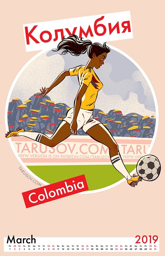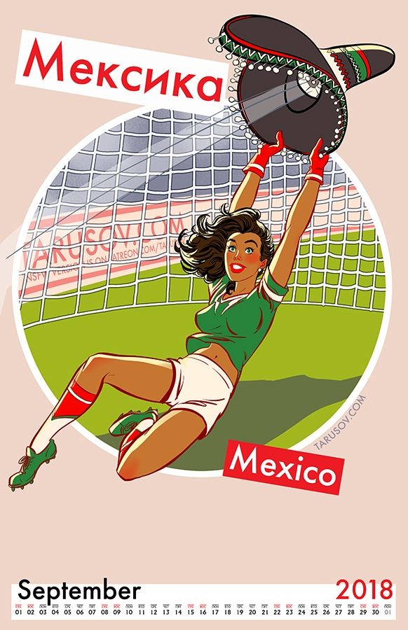 Художник Андрей Тарусов вдохновился победами российской сборной на Чемпионате мира по футболу и нарисовал тематический календарь в жанре пин-ап. Каждую сборную он представил в образе полуобнаженной девушки.
