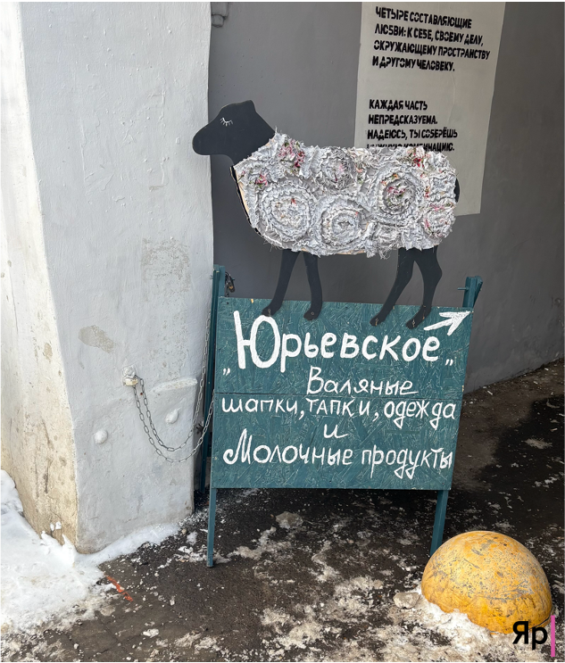 С нами произошла очень интересная история! Гуляли по Ярославлю, и вдруг — БАЦ! — мой взгляд просто врезается в какую-то безумно красивую картинку. Краешком глаза зацепилась за зелёную дощечку, а рядом... овечка! Будто живая, с таким спокойствием. Любопытство разорвало изнутри — что там такое?