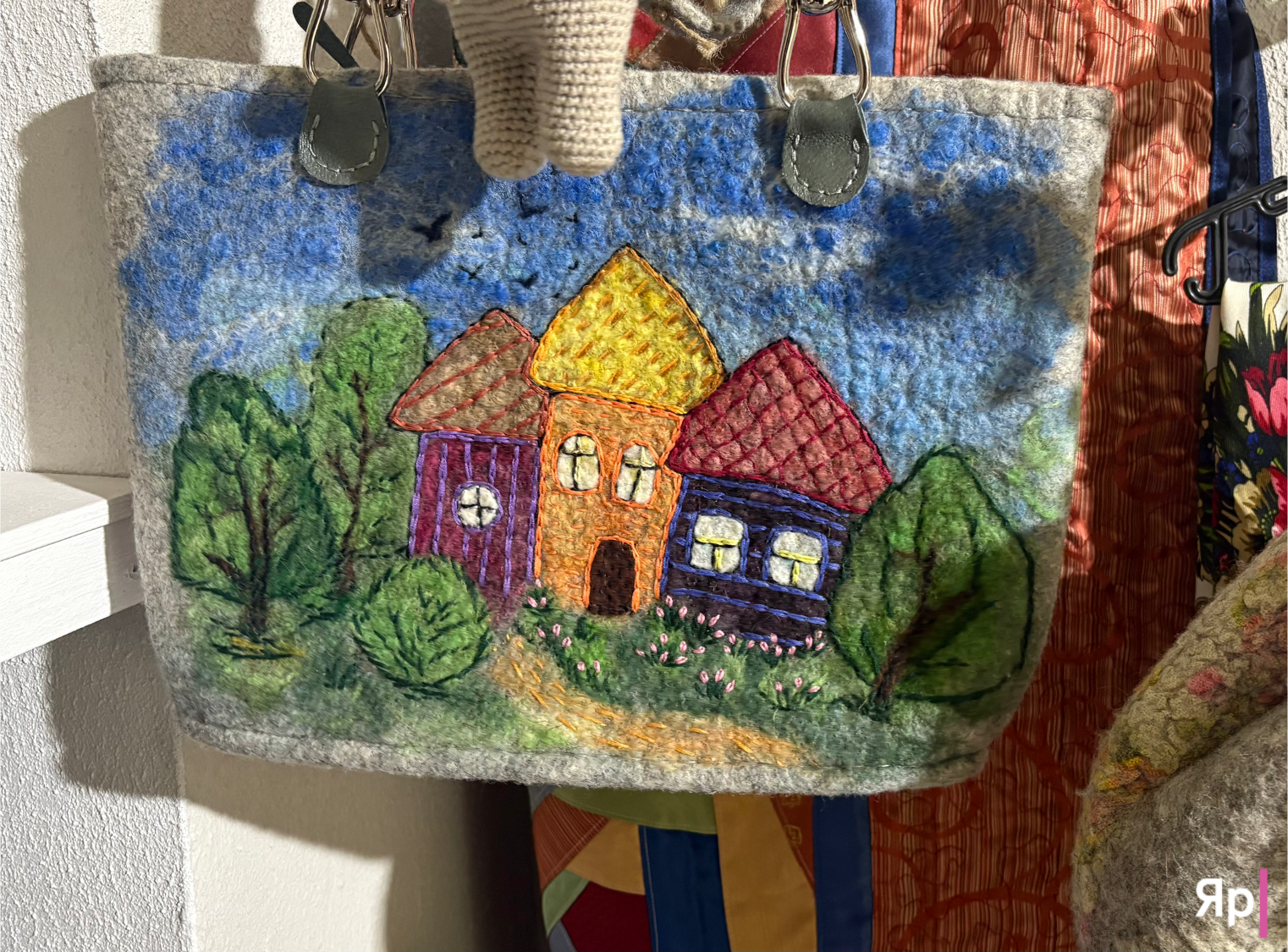 Мастера «Юрьевского» умеют создавать и аксессуары для современной жизни. Например, есть сумочка, на которой вышит целый сюжет: уютные домики под высоким небом. Это не просто аксессуар — это настоящее произведение искусства, милое и трогательное.