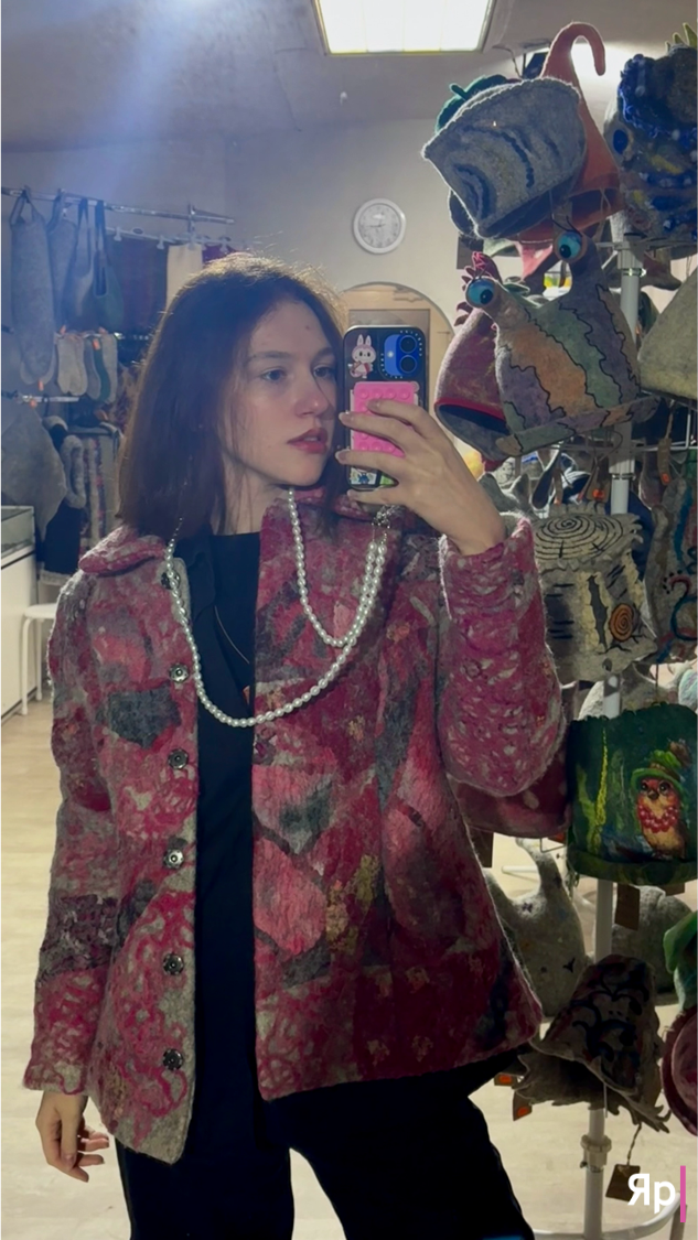 Вот невероятный розовый пиджак с деликатным блеском. Он сшит из мягкой, живой овечьей шерсти. В нём есть какая-то магия: он невероятно тёплый и уютный, но при этом выглядит так стильно, что сразу выделяется среди толпы.