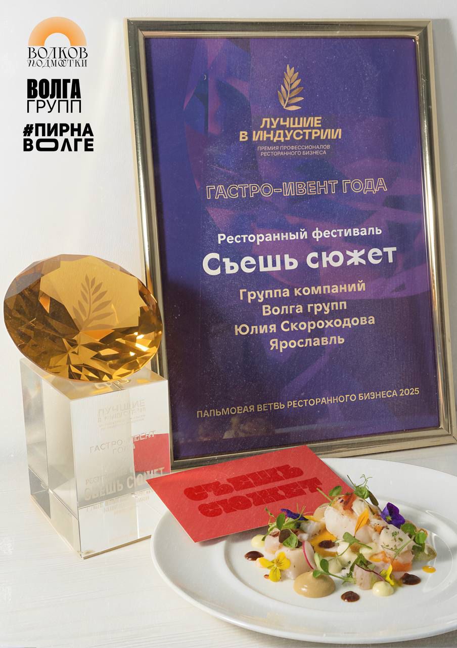 Ярославский фестиваль «Съешь сюжет» признан «Гастро-ивентом года» на всероссийской премии «Лучшие в индустрии. Пальмовая ветвь ресторанного бизнеса». Фестиваль, организованный «Волга групп» совместно с фестивалями «Пир на Волге» и «Волков. Подмостки», прошёл с апреля по июнь 2025 года и был посвящён 275-летию Первого русского.