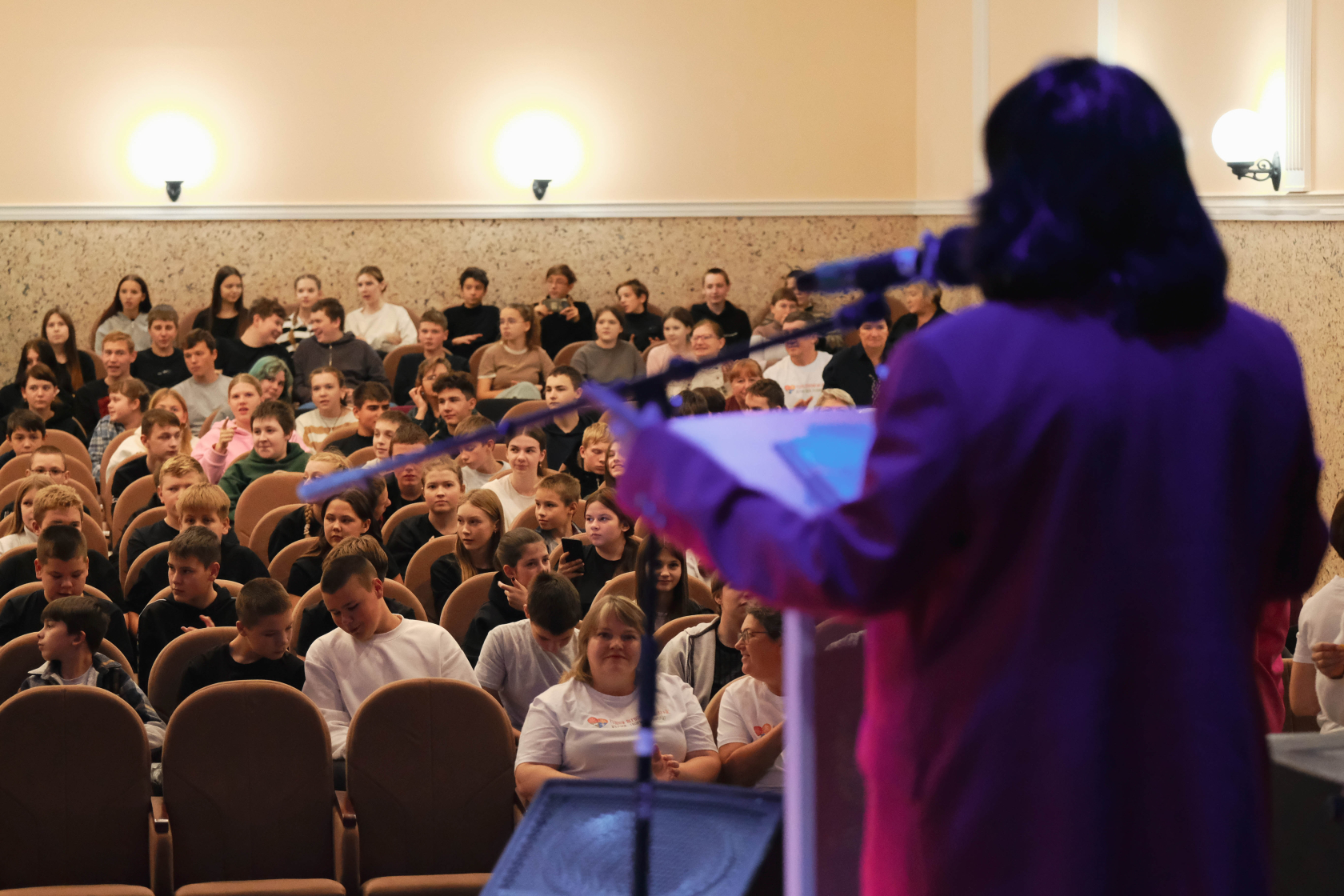 В актовом зале царила атмосфера творчества. На сцене под звуки баяна выступали сёстры Алфеевы, известные в округе как трио «Сестрёнки». Именно под их руководством ребята в рамках творческой секции проекта попробуют превратить стихи первомайских поэтов в музыкальные композиции.