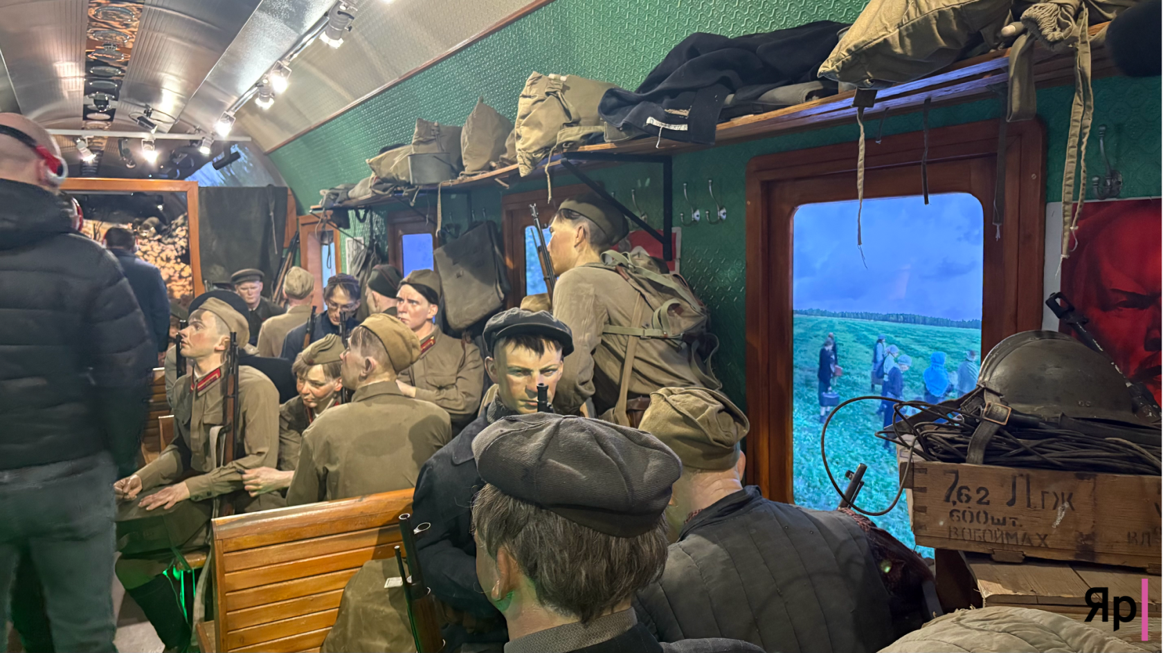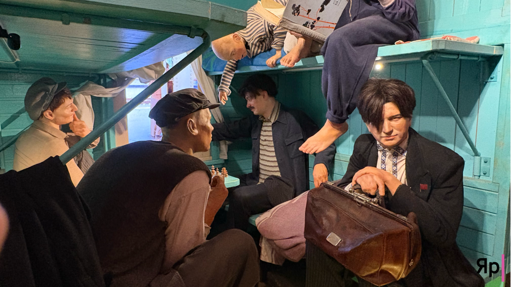 Первый вагон встретил тишиной. Фигуры сидели на полках, стояли у окон. Мирные лица, старые чемоданы, плакаты тех лет — всё говорило о жизни, которая была здесь совсем недавно. Обычной, счастливой, беззаботной. Но фигуры будто провожали взглядом. Прошлое смотрело в спину.