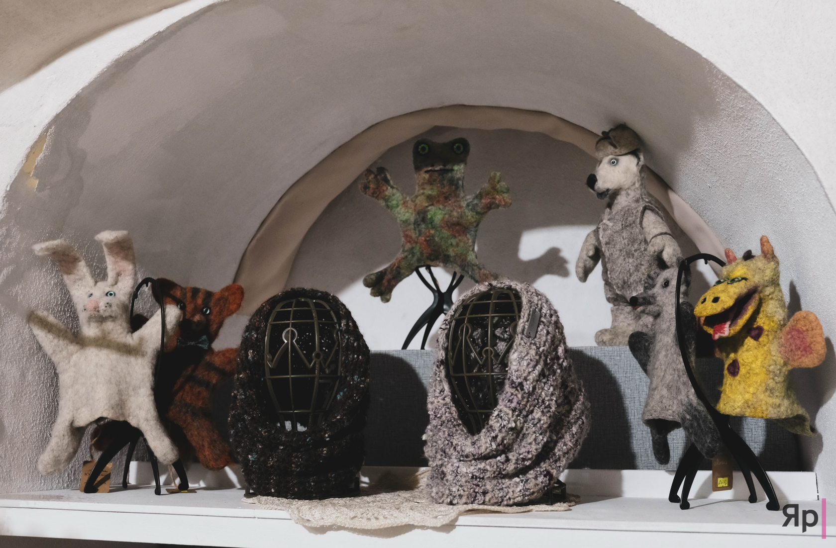 На полках и витринах самые разные вещи, изготовленные вручную: банные и ярмарочные шапки, так называемые «зверошапки», тёплые тапки, пояса для здоровья и стельки, сумки из войлока, валяные платья и кокошники. Многие из этих изделий можно не только посмотреть или примерить, но и купить. Так что узнать о свойствах материала или технике изготовления можно из первых уст.