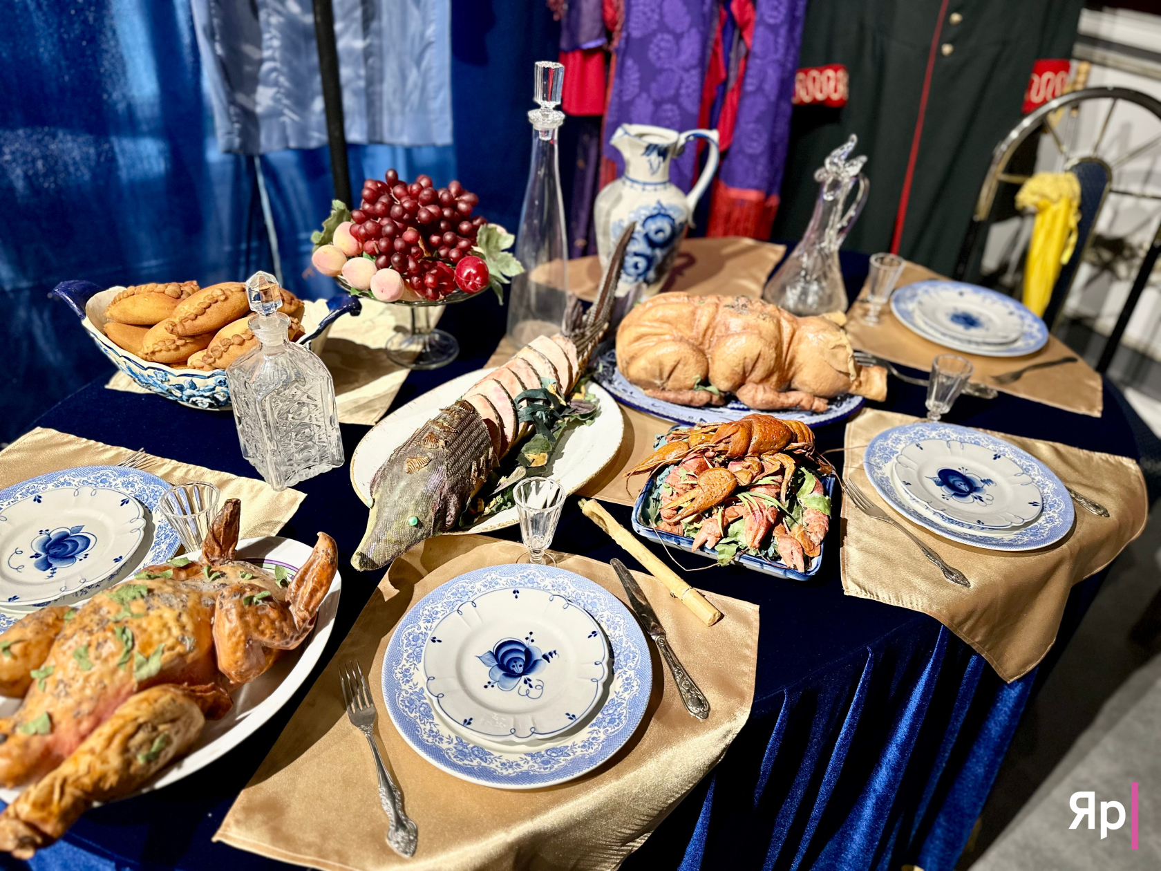 Экспозиции по спектаклям, сыгранным в стенах кафе, действительно поражают. Посетители видят стол, накрытый к спектаклю «Русский ланч»: бутафорский поросёнок с румяной корочкой, осетрина, раки. Когда спектакль играли при полном зале, блюда готовили настоящими: они парили, источали ароматы, и зрители оказывались внутри застолья, чувствовали голод, тянулись к тарелкам — это театр, который можно попробовать на вкус.
