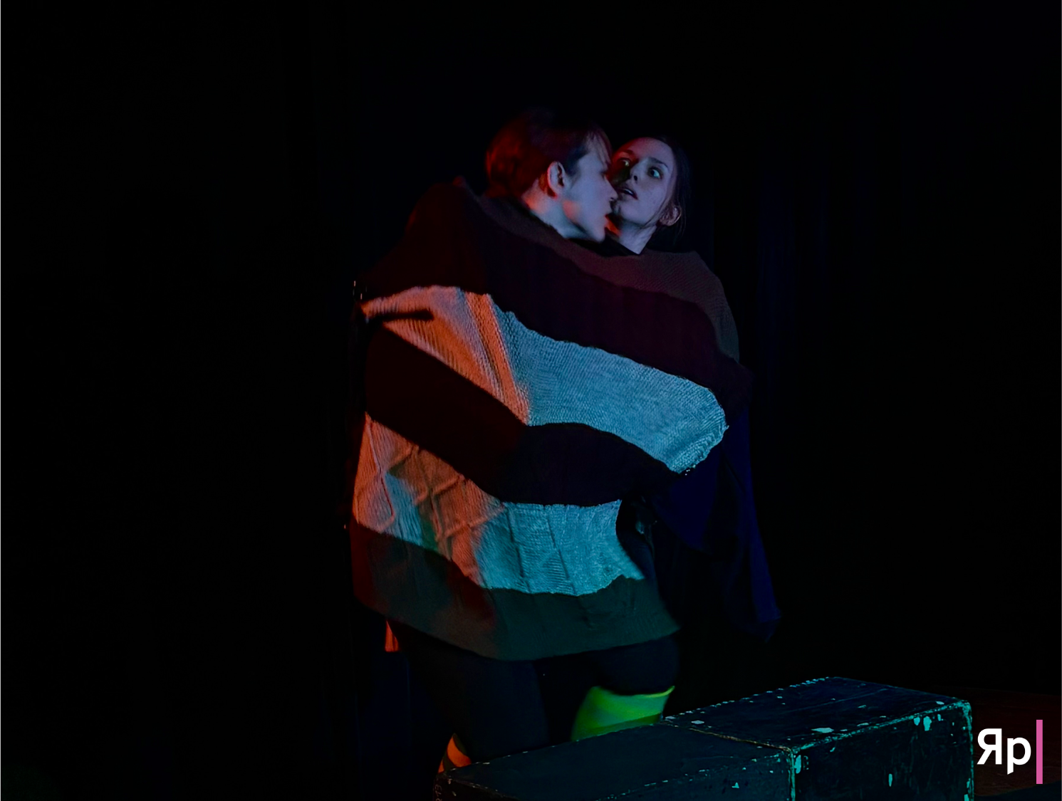 На маленькой сцене появляются студентки театрального института: две девушки в одном огромном свитере. Сначала кажется, что это просто этюд на пластику, но потом свитер начинает жить: он то объединяет их в одно целое, то становится предметом борьбы за главенство. Руки переплетаются, ноги сплетаются в узлы, и вдруг из этого хаоса рождается слон.