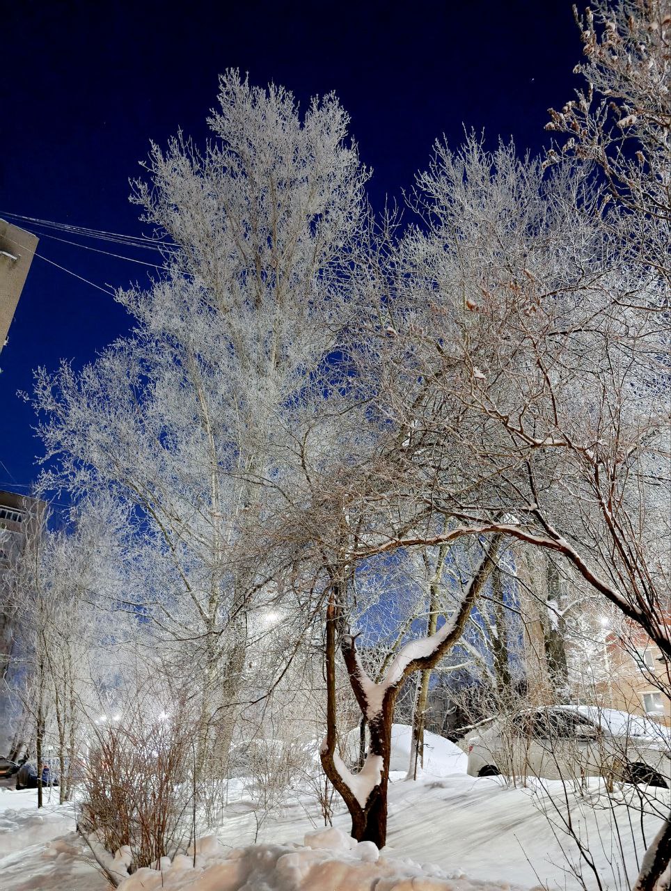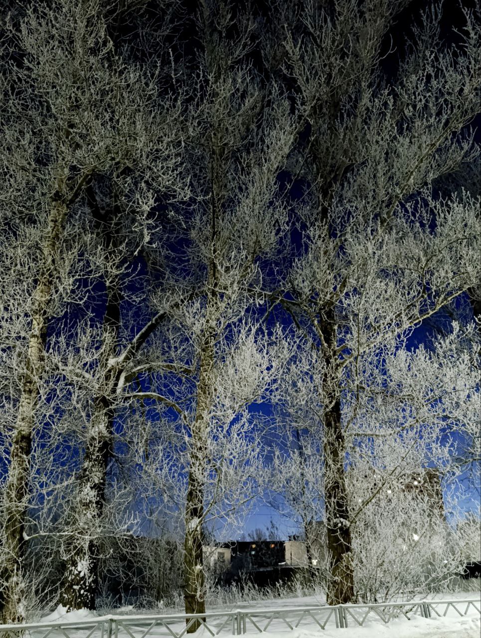 Это звёзды упали на дерево? На бархатном сине-чёрном небе — чистейшая белизна. Ветви сплетены в кружево тоньше паутины. Это не пейзаж, а тихая симфония для глаз.