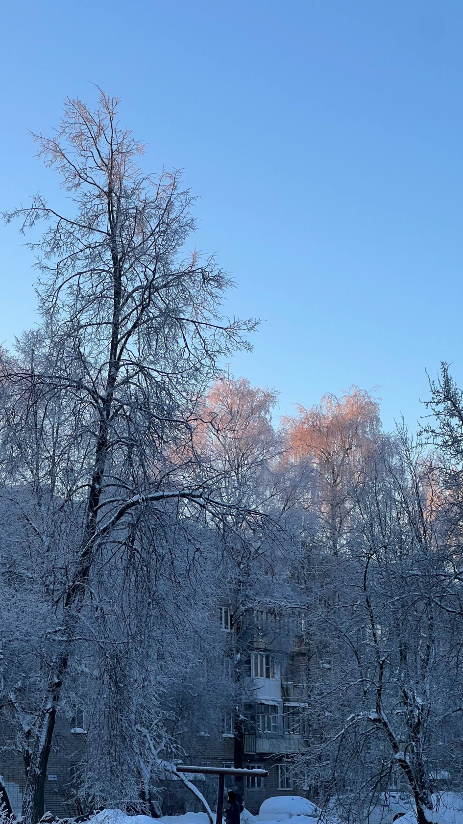 Это оставленное кем-то розовое пятно? Рассвет крадётся, окрашивая иней в персиковый. Небо в это утро яркое, словно застывшее сияющее море.