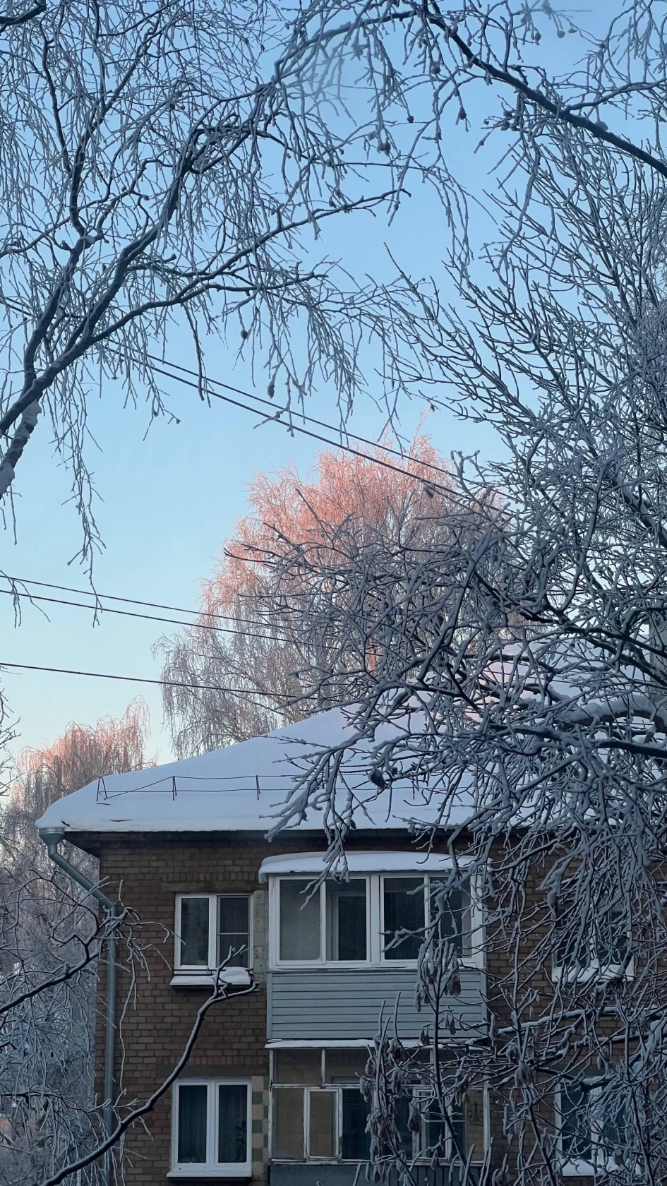 Это хрустальные веточки? Рассвет заморозил момент идеальной гармонии. Холодная белизна инея и тёплый розовый свет солнца слились воедино, создав ощущение вневременной, хрупкой и совершенной красоты.