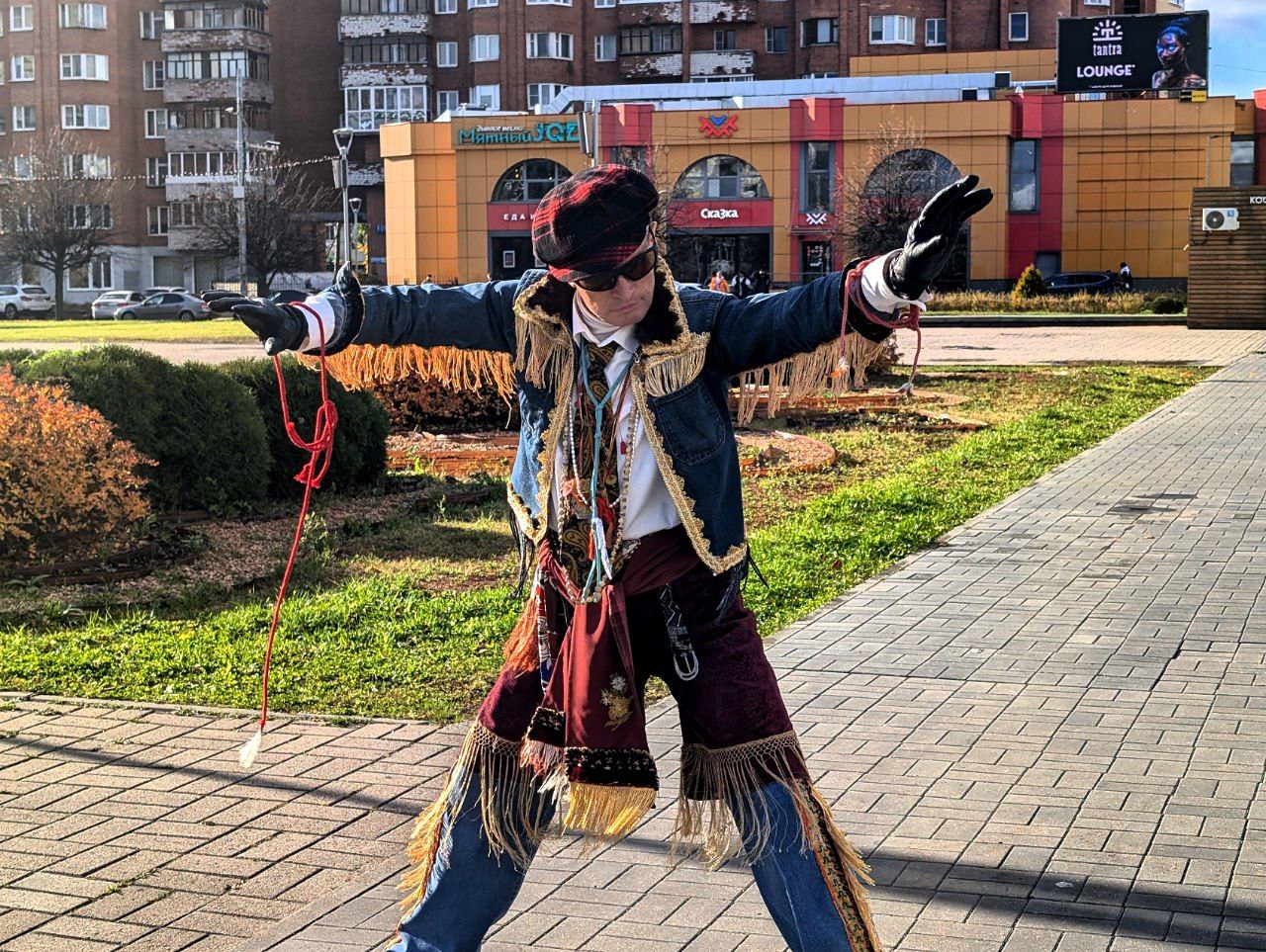 Ярославцы на улицах и площадях города всё чаще стали замечать мужчину, танцующего в необычных костюмах. Слишком, пожалуй, яркий, в своих неизменных солнцезащитных очках и джинсовке, отороченной мехом... Одни восхищаются, другие молча улыбаются, третьи скорее хватаются за телефон, а кто-то даже крутит пальцем у виска. И всё же прижился он среди серых городских будней.